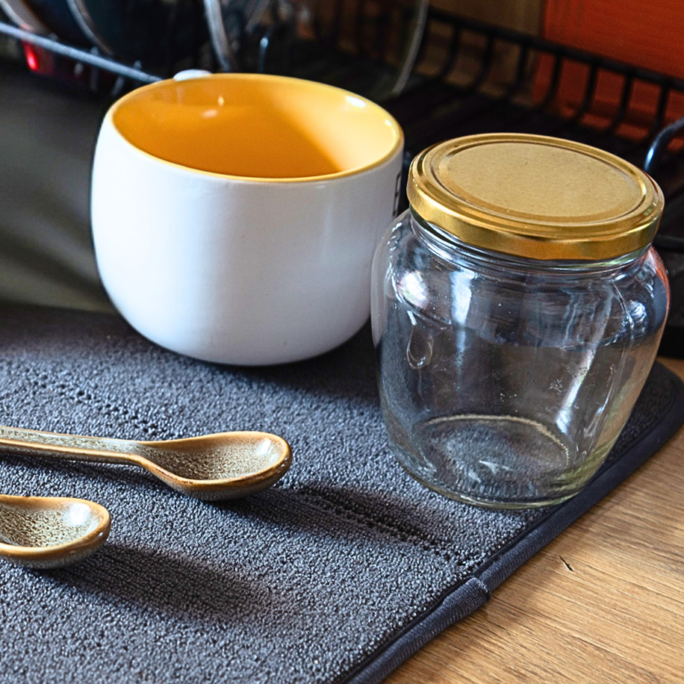 An absorbent coffee mat protects the counter from drips and splashes while keeping the coffee area tidy.