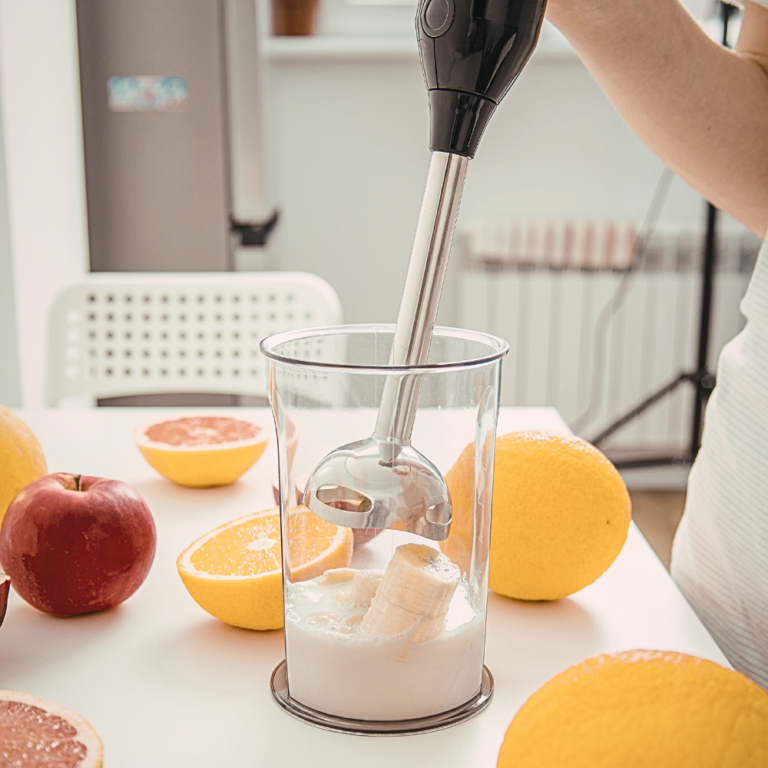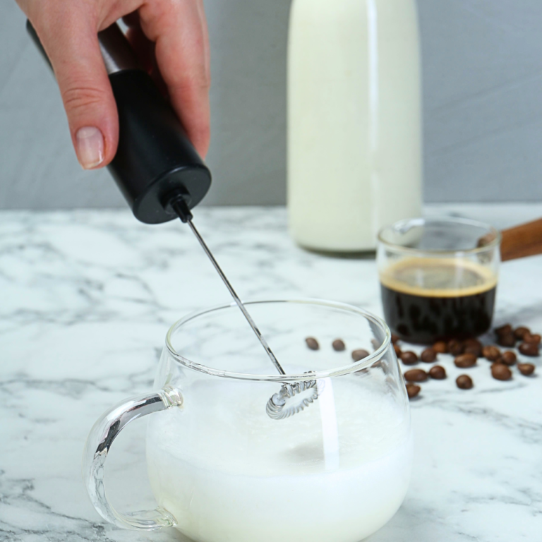 An immersion blender can be used to quickly froth milk directly in a mug or mason jar for homemade coffee drinks.