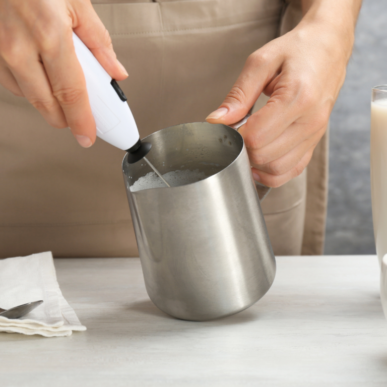 A rechargeable frother that quickly creates light, creamy milk foam for lattes, cappuccinos, and other coffee drinks.